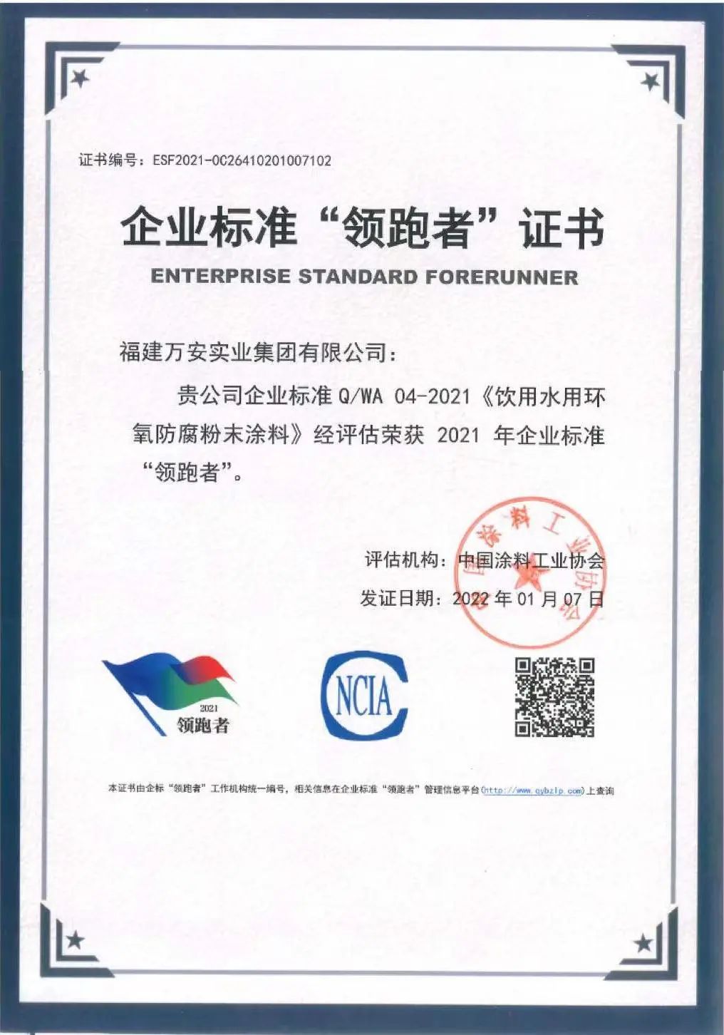 In January 2022, Wanan Group's corporate standard Q/WA 04-2021 "Epoxy Anticorrosive Powder Coating for Drinking Water" was evaluated by the China Coatings Industry Association and won the title of "Leader" in corporate standards, highlighting the market and industry's recognition of Wanan Anticorrosion Highly recognized for powder coating products.